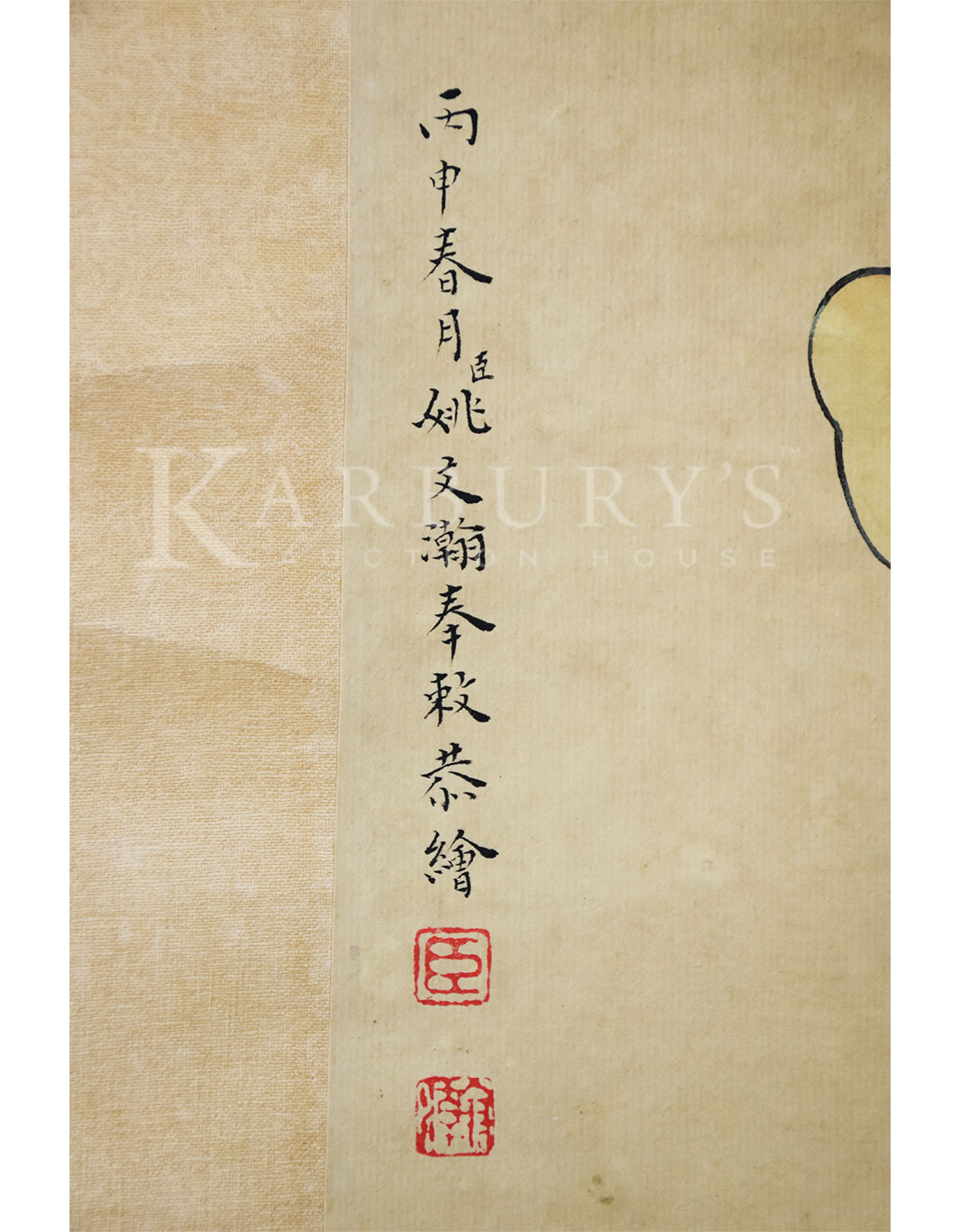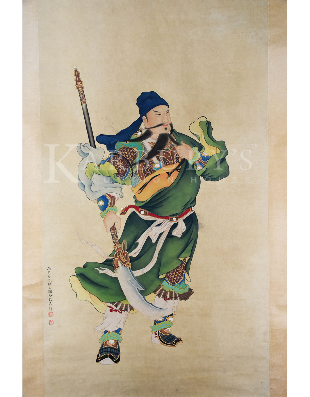 Lot: 126 Yao Wenhan (Qing Dynasty, 18th century) Portrait of Guan Yu (Guan Gong) Hanging Scroll, ink and color on paper, signed Yao Wenhan and inscribed with two seals of the artist. Size: 78 x 29 3/4 in. (198 x 75 cm.) 姚文瀚(公元18世纪)关公图 设色纸本 立轴 款识:丙申春月臣姚文瀚奉敕恭绘 钤印:臣(朱文)瀚(阴文) 姚文瀚 (公元18世纪),号濯亭,北京人,生卒年不详。乾隆时供奉内廷,工道释、人物、山水、界画,《石渠宝笈》著录其曾作《仿清明上河图》卷,文瀚于群工角艺之时,胸具别裁,画成缩本,乾隆喜而题诗并注:“此卷较择端原本尺幅纵横倍减,而临摹毕肖,人物益小,尤见精能。”乾隆十七年(1752)尝作《仿宋人文会图》卷,二十六 (1761)《紫光阁锡宴图》卷。传世作品有《四序图》 《观音像》 《文殊像》。