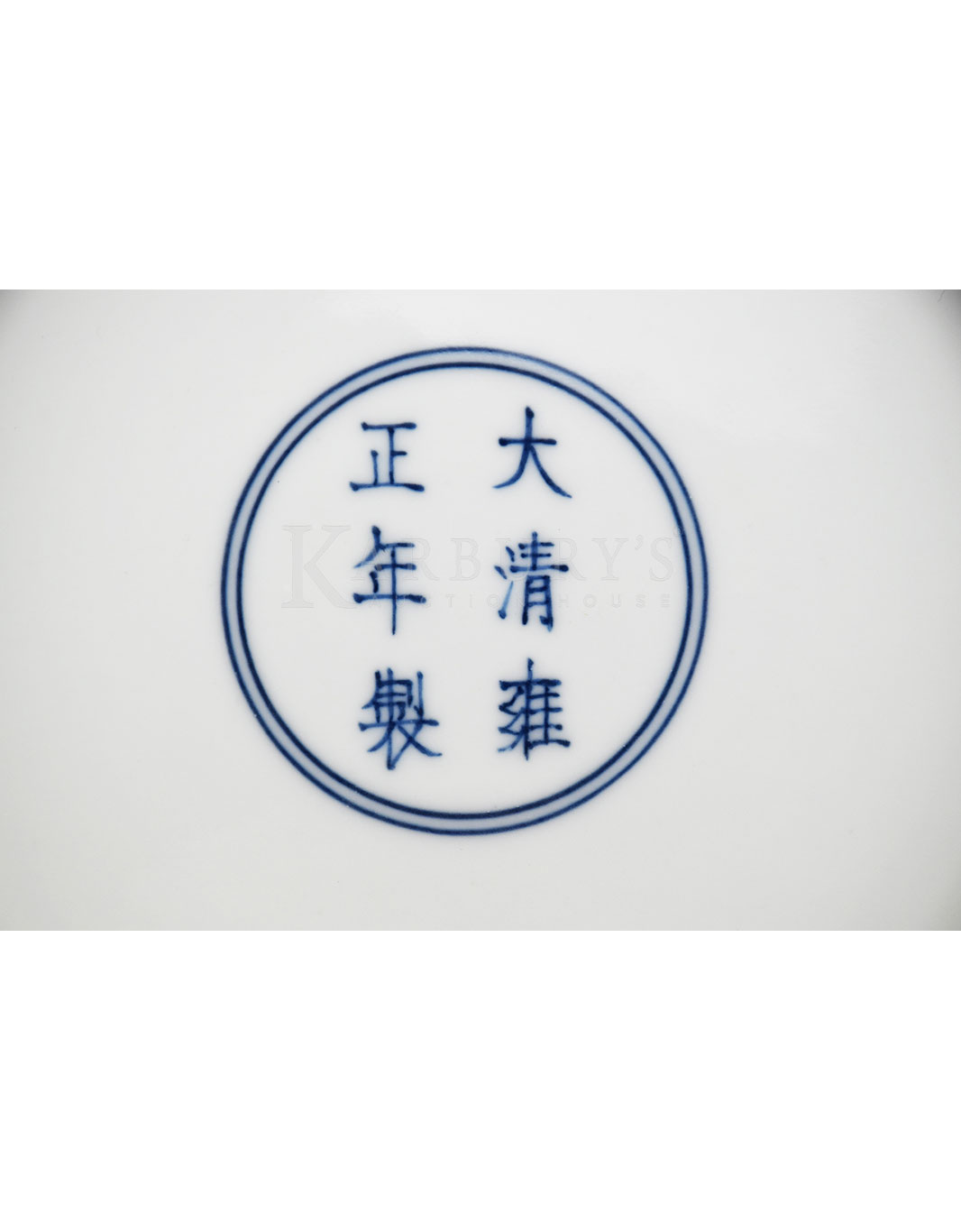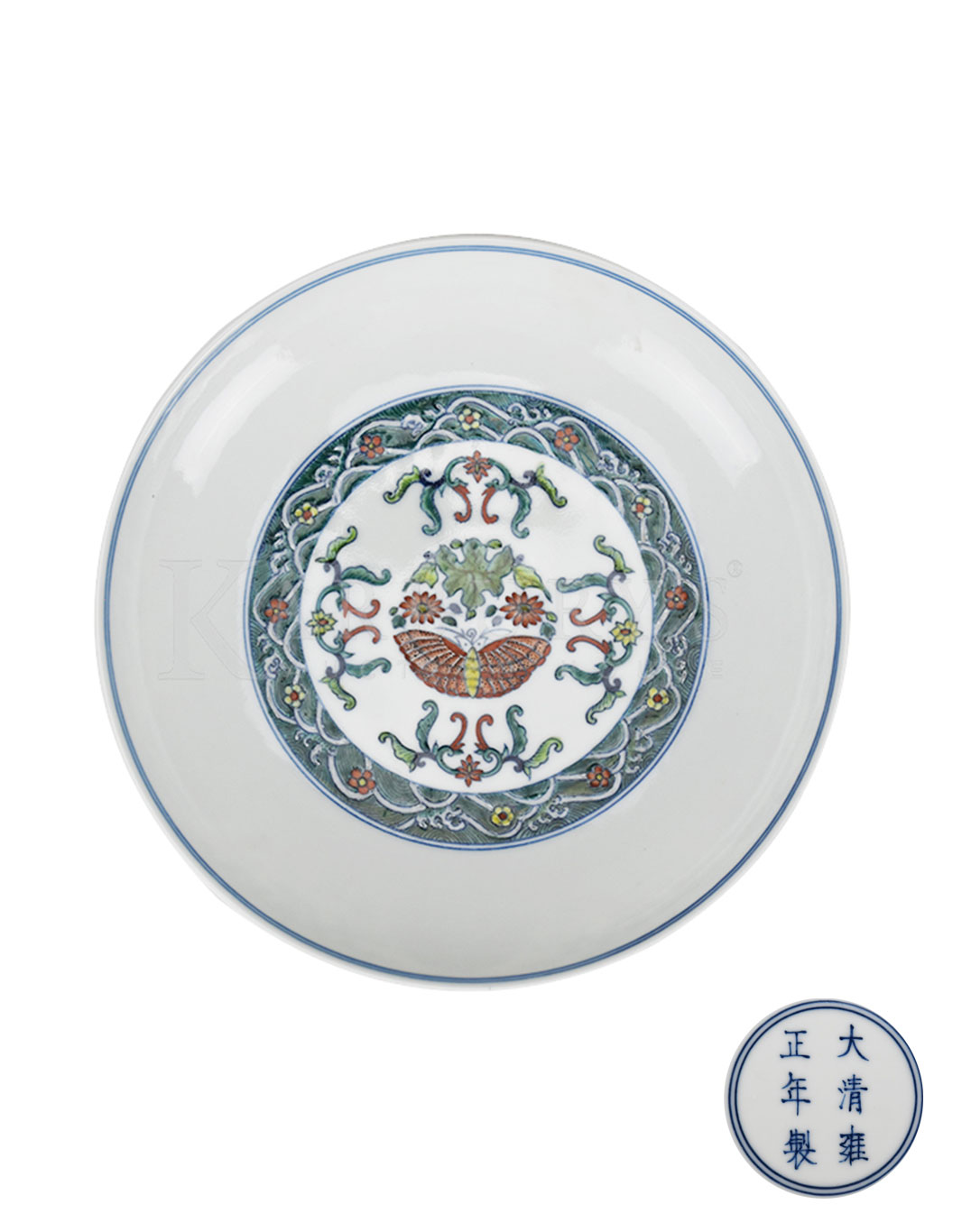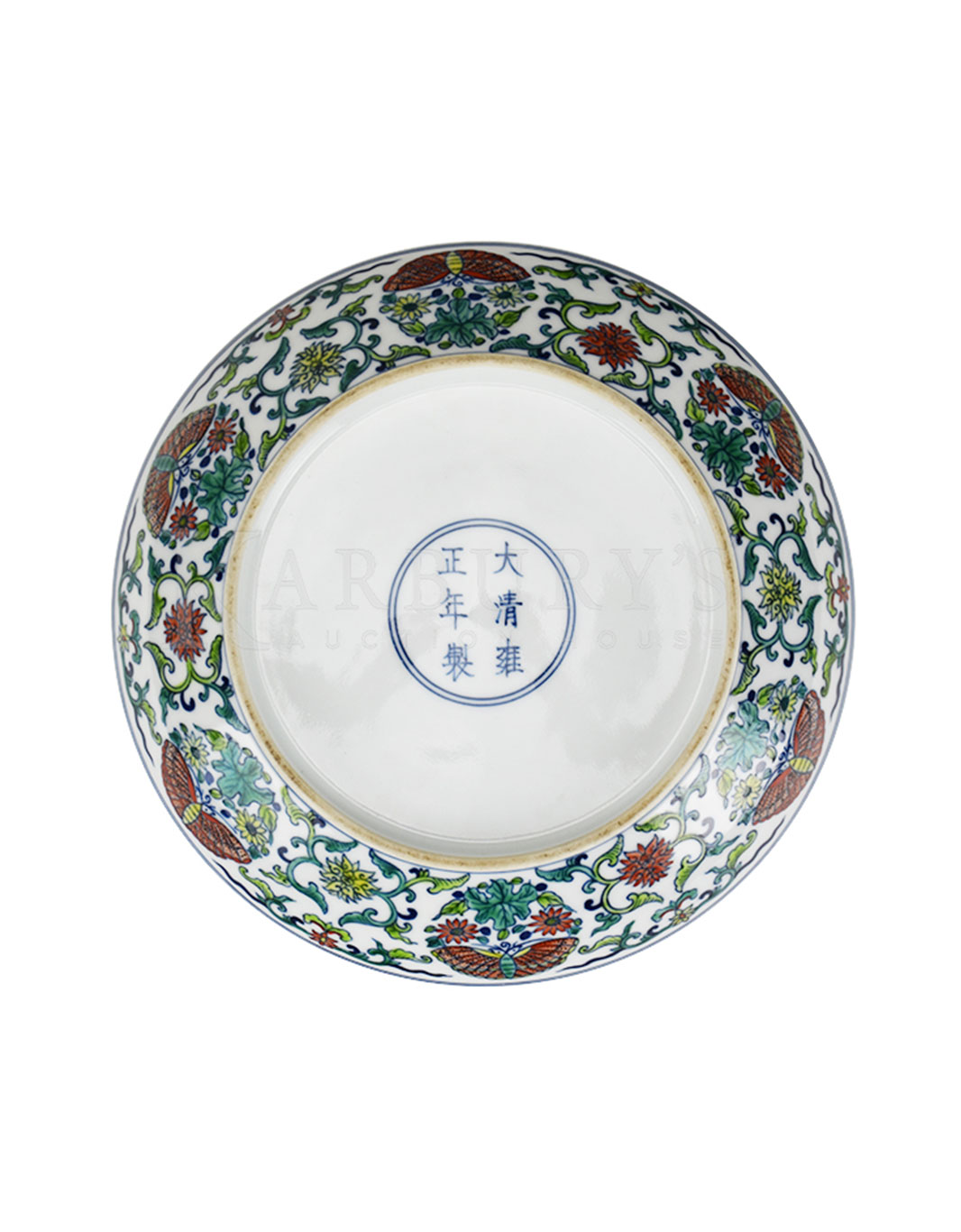Lot: 130 Doucai Butterfly Dish with a Yongzheng Mark The interior is decorated in unglazed translucent enamel with a narrow band of crashing waves and flowers encircling four separate foliate scrolls around a central medallion painted with butterfly and floral sprays. The exterior is painted with six medallions of butterfly and floral sprays separated by flower and foliate scrolls. The base is inscribed in blue underglaze with a six-character Yongzheng reign mark within a double-circle. 斗彩缠枝花卉大盘 <<大清雍正年制>> 款 Size: 8 1/4 in. (21 cm.) w