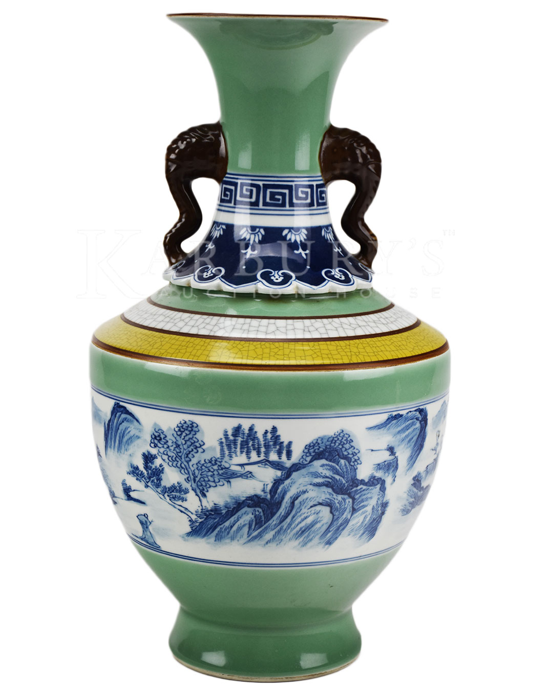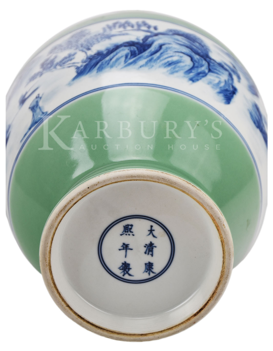 Lot: 143 Celadon Blue and White Hu Vase with a Kangxi Mark The body is decorated with a blue and white mountainous landscape between a band of celadon glazes at the collar and to the base. The vase has slightly rounded sides and angled shoulders, rising to a tall waisted neck, and is raised on a spreading pedestal foot. The surmounted neck is decorated with celadon glaze above a narrow key-fret border, and the shoulder with a band of ruyi-head skirt in cobalt blue follow with a band of celadon. There is a white ge-type glaze and yellow ge-type glaze separated by narrow brown border, and the neck is flanked by a pair of elephant head handles. The base inscribed in blue underglaze with a six-character Kangxi reign mark within a double-circle. 豆青釉青花山水兽耳瓶 <<大清康熙年製>> 款 Size: 14 1/2 in. (36 cm.) h x 7.5 in. (19 cm.) w