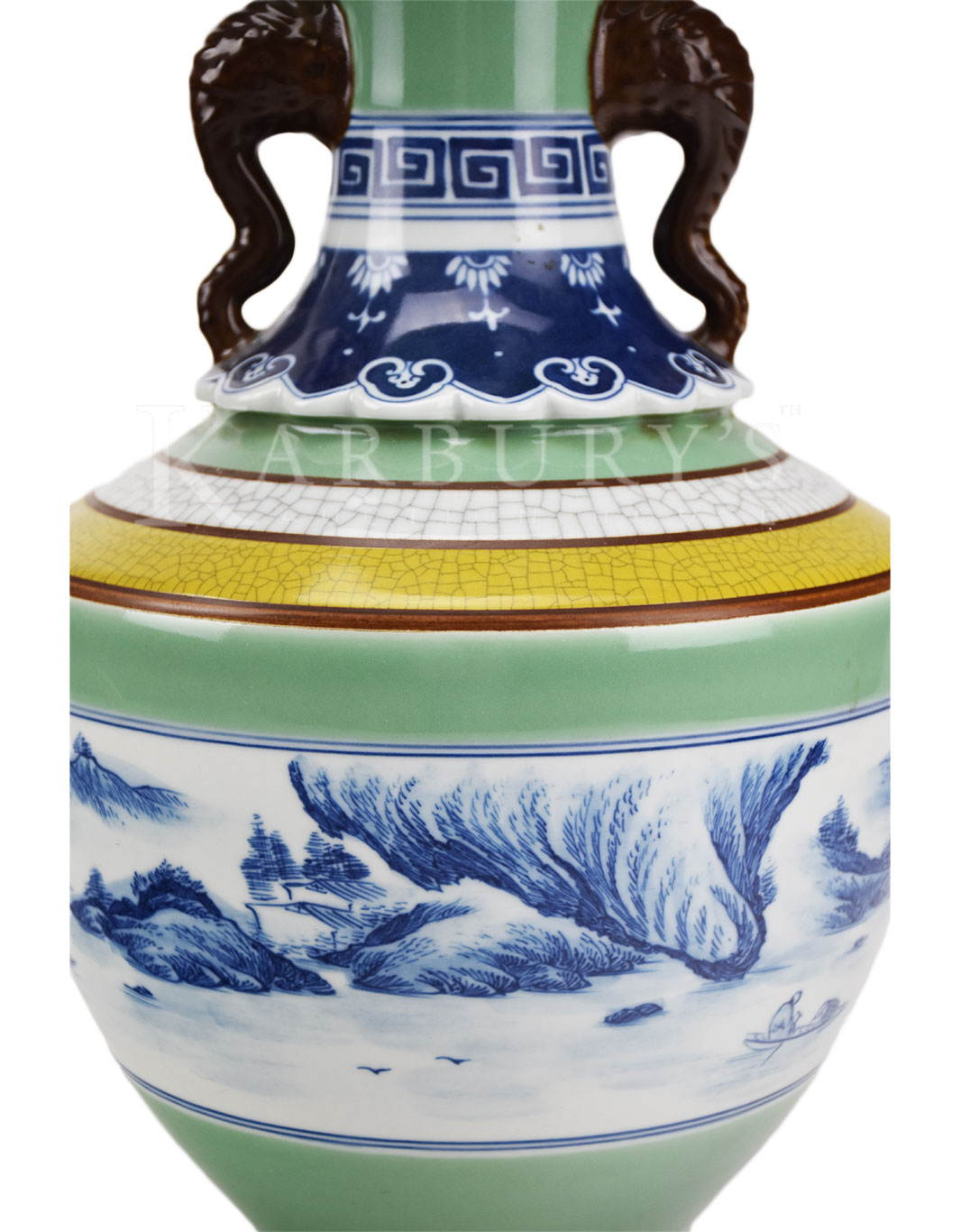 豆青釉青花山水兽耳瓶 <<大清康熙年製>> 款