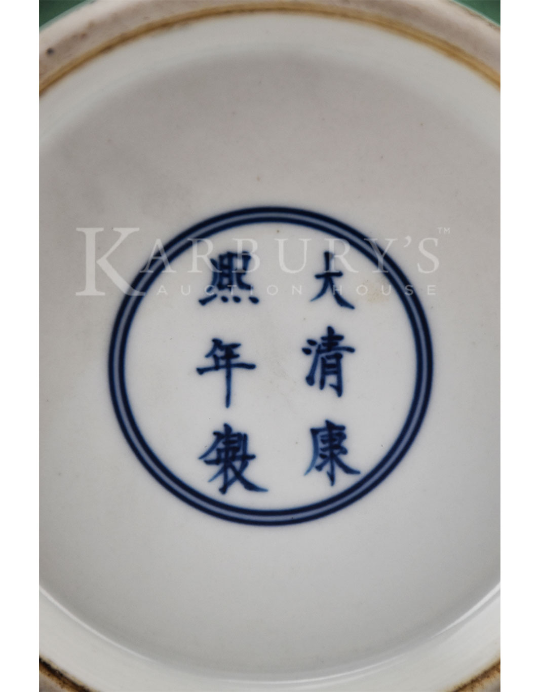 • 07/22/2017 06:00 PM 07/22/2017 08:00 PM America/New_York Celadon Blue and White Hu Vase with a Kangxi Mark Lot: 143 Celadon Blue and White Hu Vase with a Kangxi Mark The body is decorated with a blue and white mountainous landscape between a band of celadon glazes at the collar and to the base. The vase has slightly rounded sides and angled shoulders, rising to a tall waisted neck, and is raised on a spreading pedestal foot. The surmounted neck is decorated with celadon glaze above a narrow key-fret border, and the shoulder with a band of ruyi-head skirt in cobalt blue follow with a band of celadon. There is a white ge-type glaze and yellow ge-type glaze separated by narrow brown border, and the neck is flanked by a pair of elephant head handles. The base inscribed in blue underglaze with a six-character Kangxi reign mark within a double-circle. 豆青釉青花山水兽耳瓶 <<大清康熙年製>> 款 Size: 14 1/2 in. (36 cm.) h x 7.5 in. (19 cm.) w Karbury's Karbury's Karbury's false MM/DD/YYYY