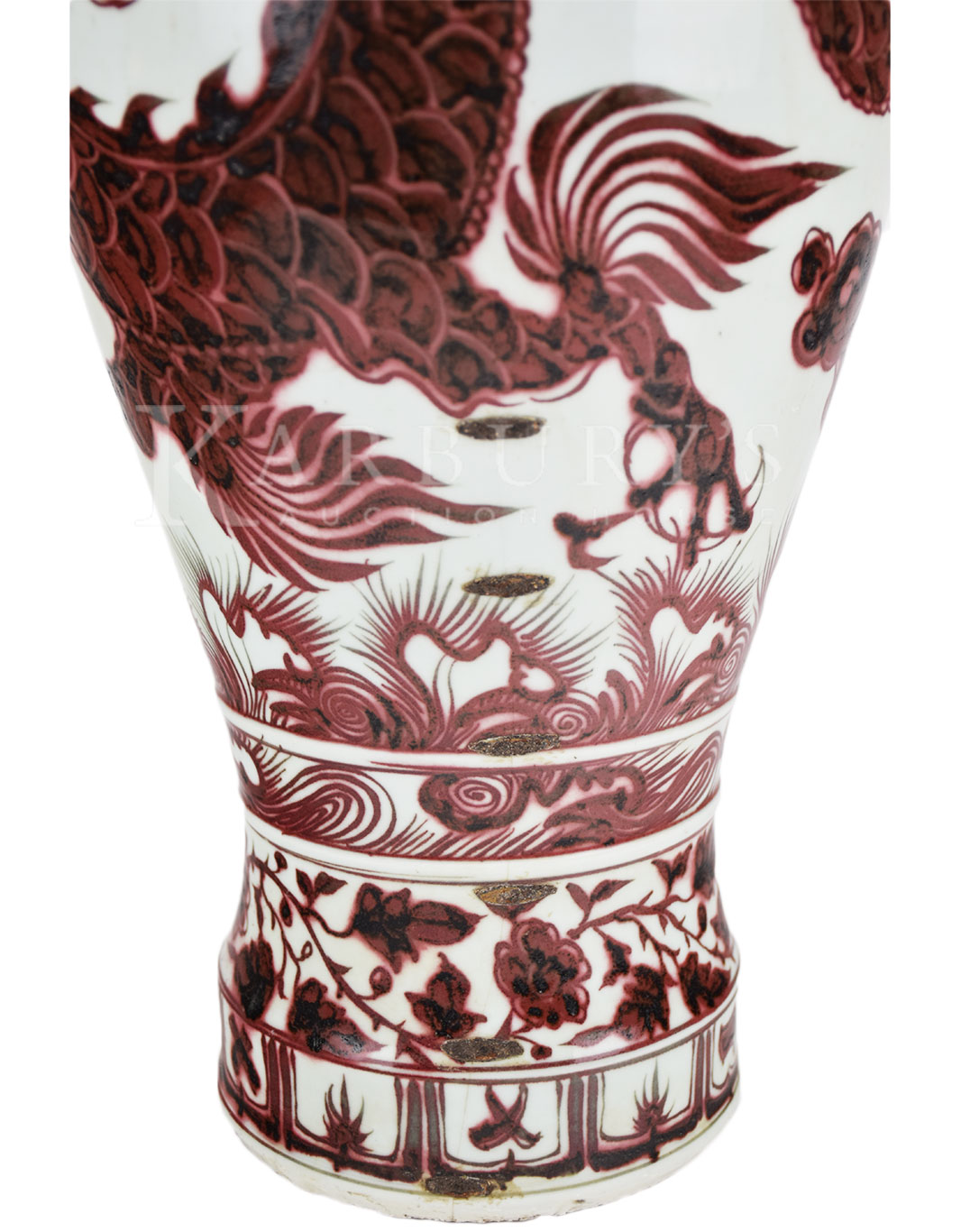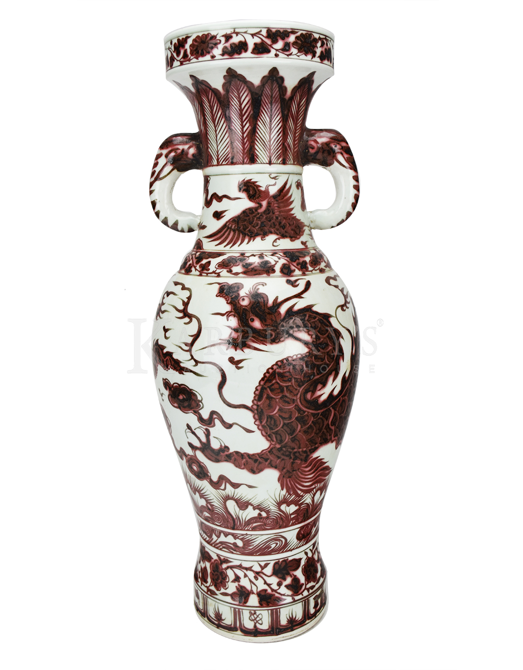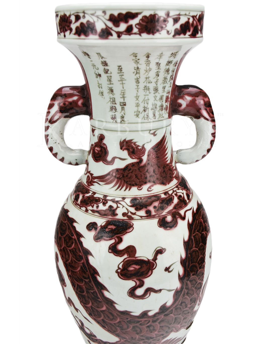 Lot: 147 Tall Slender Copper-Red Phoenix Tail Vase This is a tall and elegant baluster body surmounted by a tall waisted neck rising to a straight mouth painted with a band of floral scroll, and is supported on a waisted foot. The neck is decorated with a phoenix amongst clouds above a band of floral scroll at the shoulder, and painted with a band of leaf tips on one side and calligraphic inscriptions on the other. The body is decorated with a dragon amongst clouds, above a band of waves, and the foot is embellished with a band of lappets below a band of floral scroll. Condition: Repair of crack with iron nails from mid-body to base. 釉里红象耳盘口瓶 Size: 25 in. (63 cm.) h x 7 in. (17 cm.) w