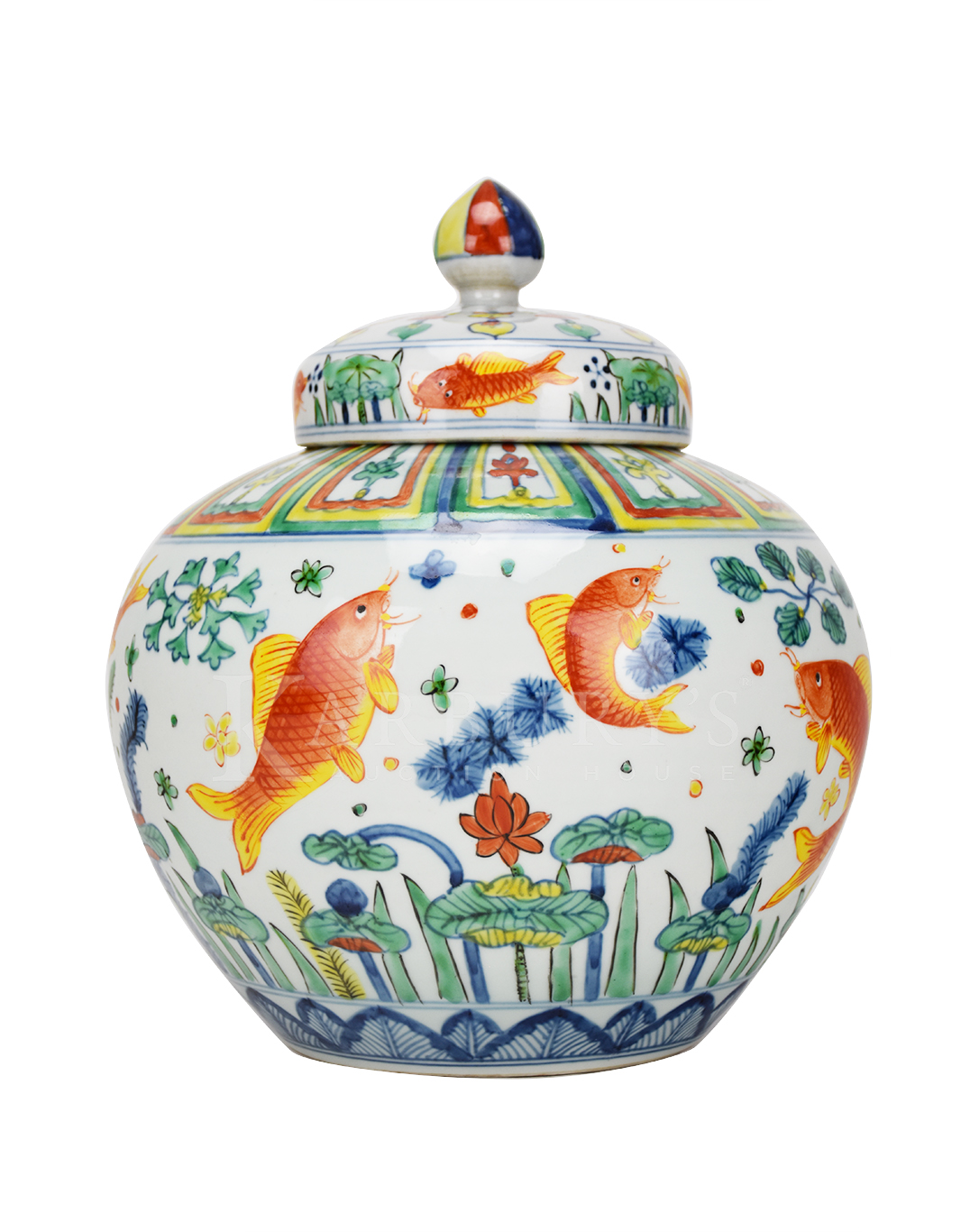 A Wucai Fish Jar with Cover with a Jiajing Mark