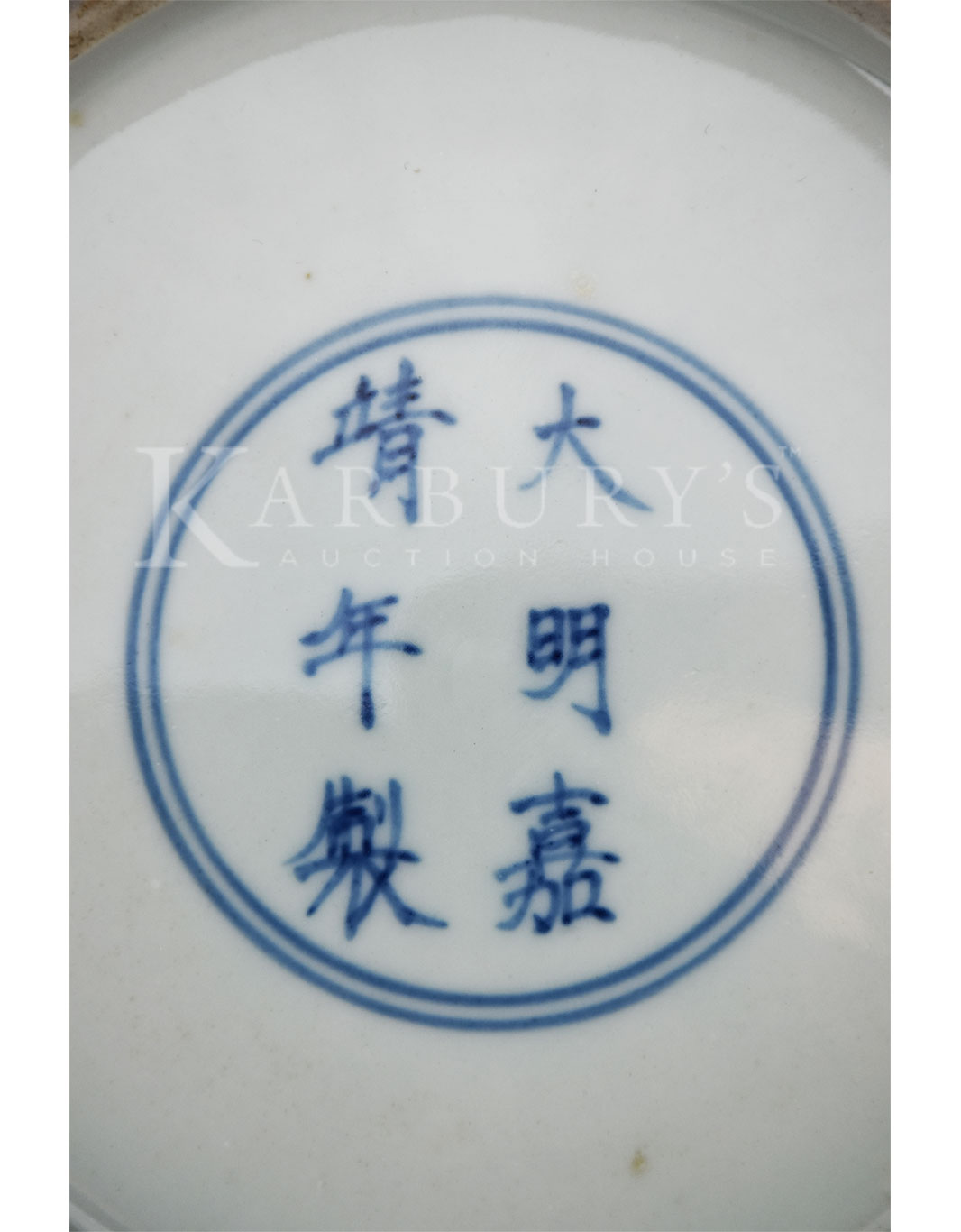 This globular jar is decorated with carps swimming amongst aquatic plants. Wide leafy petals in cobalt-blue embellish the foot while a band of lappets are seen at the shoulder. The base is inscribed with a six-character Jiajing reign mark.