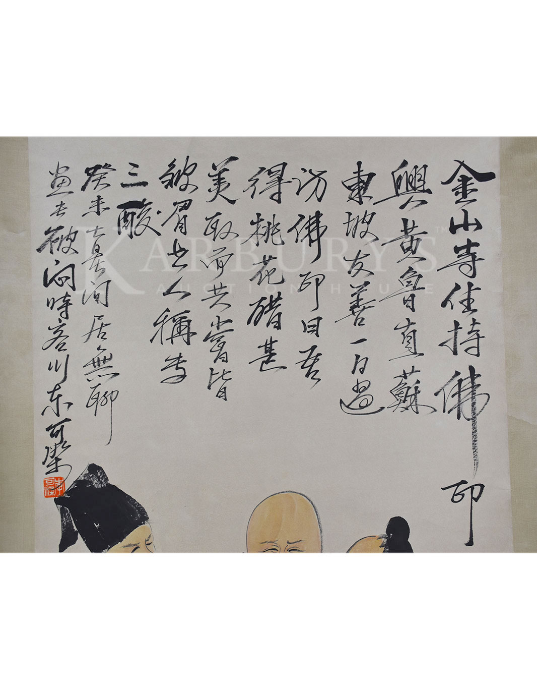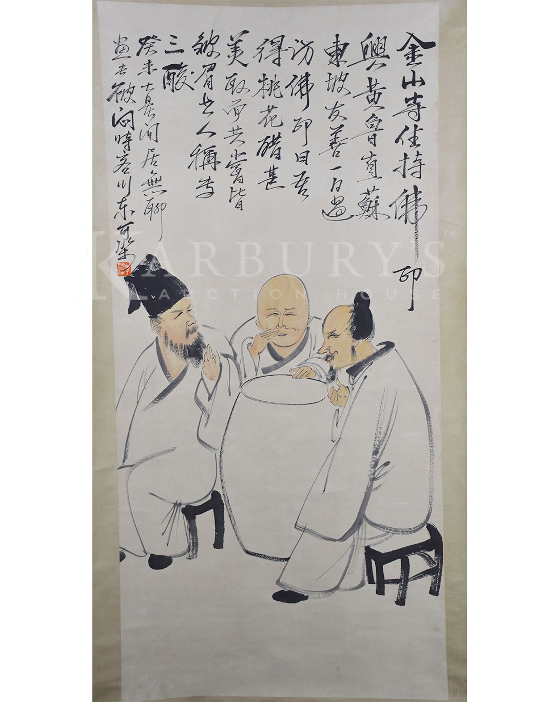 Lot: 175 Li Keran (1907-1989) Monk and Two Scholars with Peach Vinegar Hanging scroll, ink and color on paper, signed Li Keran, titled; and inscribed and with one seal of the artist. Size: 78 by 31 in., 198 by 78 cm 李可染 (1907-1989) 三酸图 设色纸本 立轴 款识: 金山寺,住持佛印兴黄鲁直,苏东坡友善,一日过,访佛印日去得桃花醋,甚美取面,共当皆皱眉书人稱春三酸,癸末七日,居间居无聊当春破闷时客川,东游击队东可染。 钤印: 李可染(阴文) 李可染(1907年-1989年),江苏徐州人,中国当代著名画家。以创作山水画为主。画家齐白石的弟子。李可染自幼即喜绘画,13岁时学画山水。43岁任中央美术学院教授,49岁为变革山水画,行程数万里旅行写生。72岁任中国美术家协会副主席、中国画研究院院长。晚年用笔趋于老辣。擅长画山水、人物,尤其擅长画牛。其风格影响了颇多后来者,诸如刘大为、陈玉先、冯远等人,也是书法家。