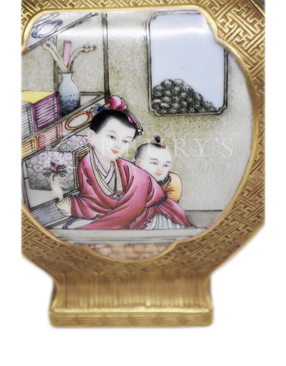This square shaped vase has a bulbous body decorated in Famille rose enamel with four shaped panels with scenes of children and peony sprays with birds. The panels are surrounded with beautifully carved key fret motif and at the mouth there is a band of lappets. The waisted neck flares to the top and the each side is carved with bats above and below a Fu symbol (Fu or Bat, motif of prosperity and good fortune, and happiness.) The foot has a band of lappets and the base is incised with a three-columns six-character Qianlong reign mark.