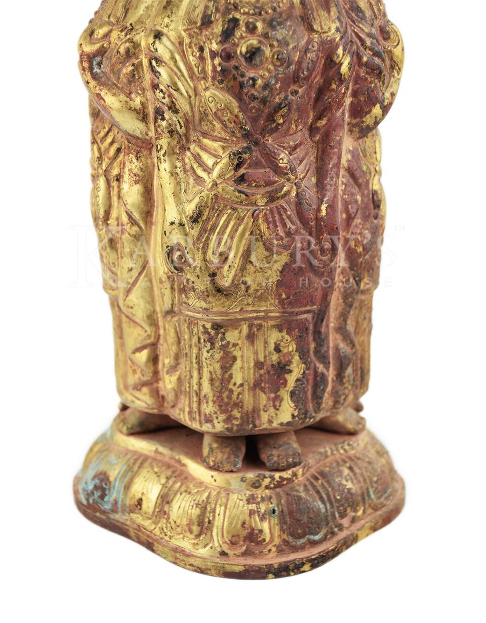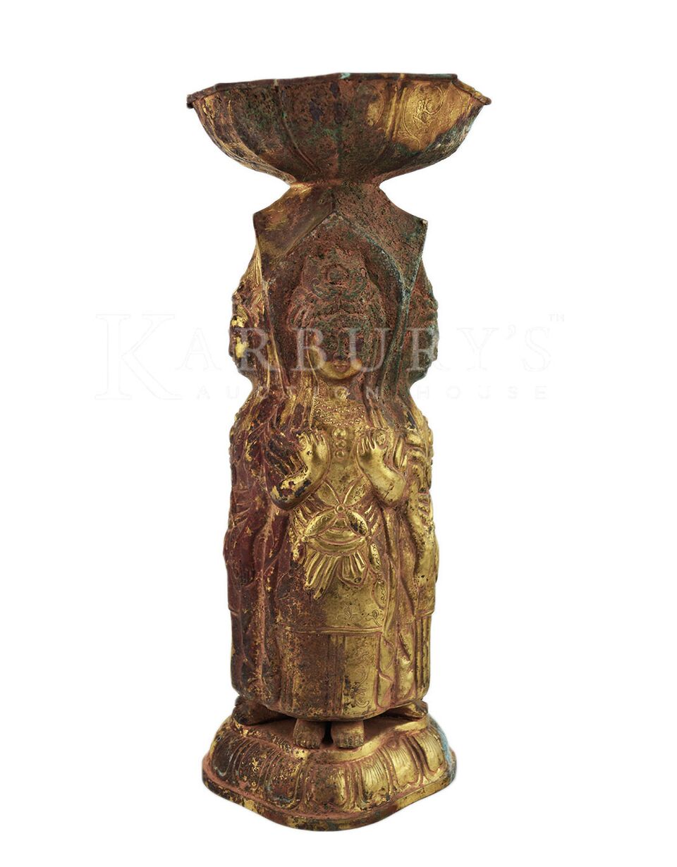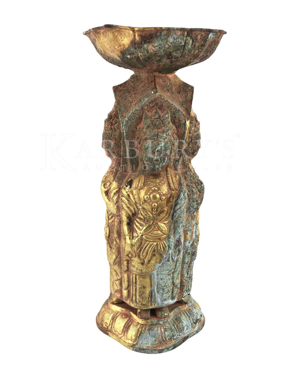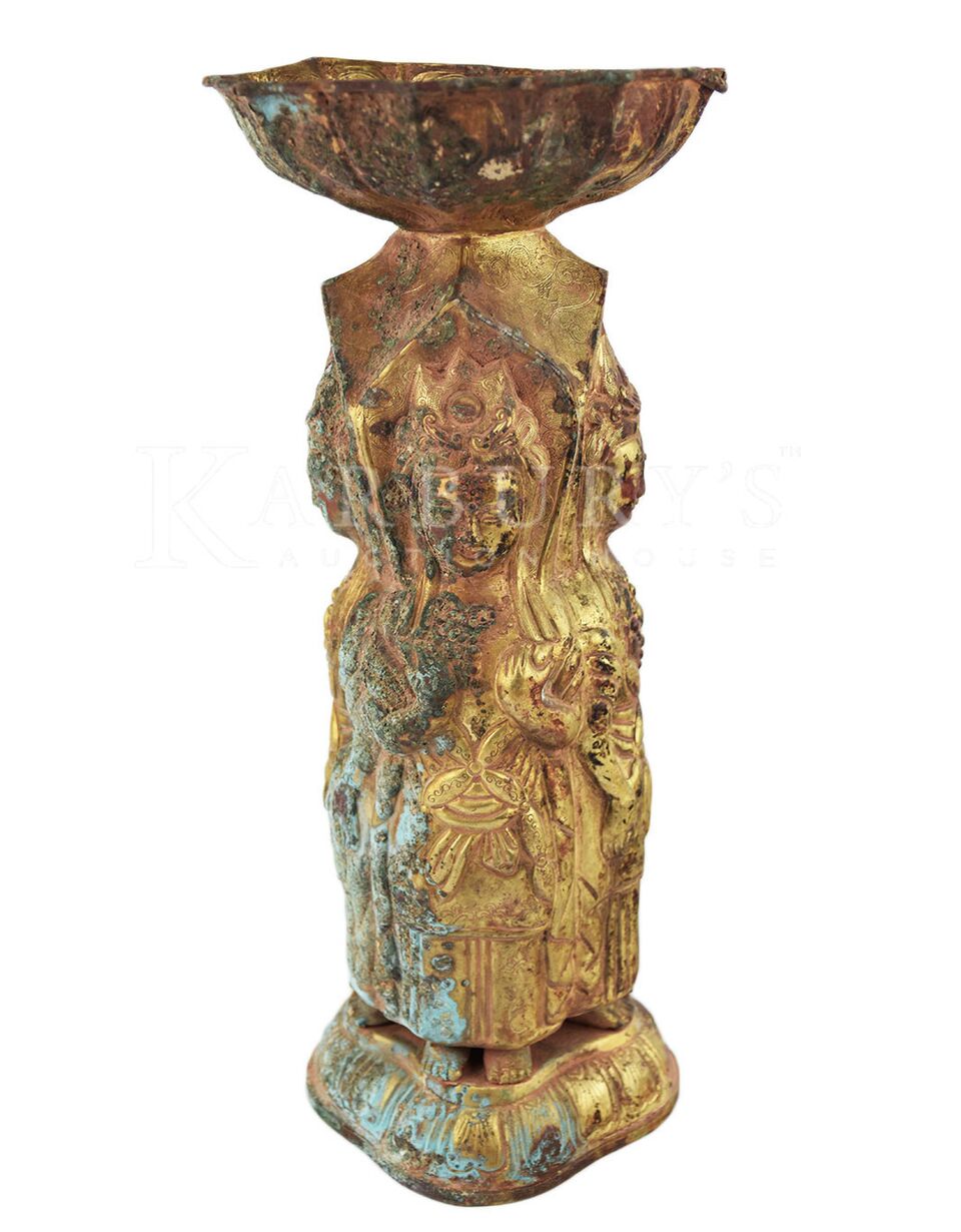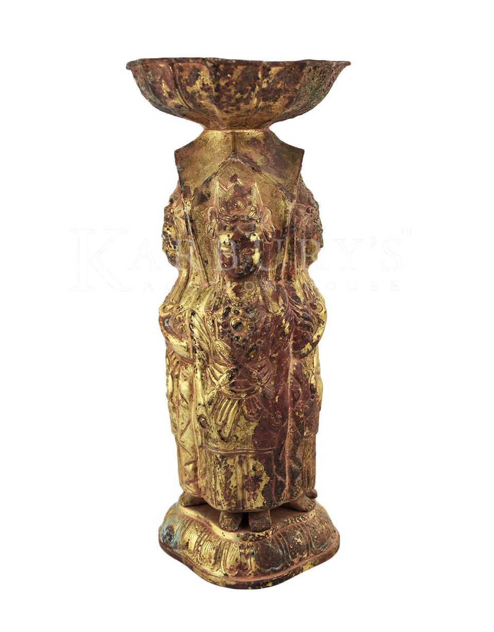 Gilt Bronze Ritual Vessel in Tang Style. Repoussé of four standing Bodhisattva figures on a single level lotus base. A bowl is surmounted on the vessel. Bronze technology has a long history in ancient China, known to have been developed as early as 2000 B.C.